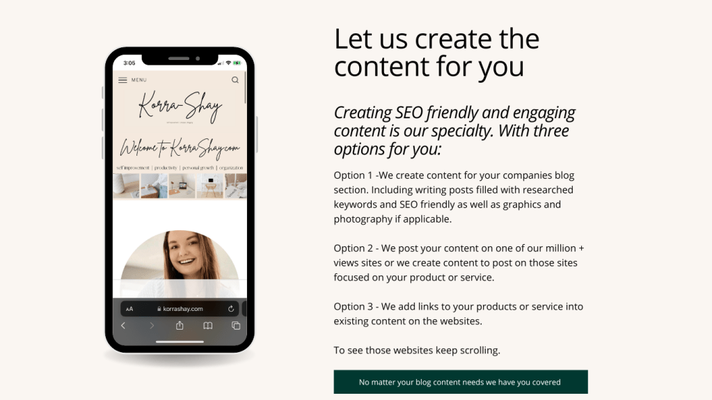 We create content for your site and offer opportunities to promote your content within one or multiple of our in-house high reaching sites.